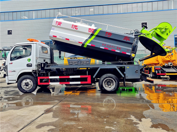 吸污部分:3.8方污罐,罐体5mmQ235优质碳钢,配淄博SK-9水循环泵,8米吸污管一根,进气管加过滤网,防溢阀加高,后盖卡扣锁紧,前视污亮管,后尾部加装1个力拓牌100mm的球阀均带出口,罐体带举升功能,后门带液压开启。