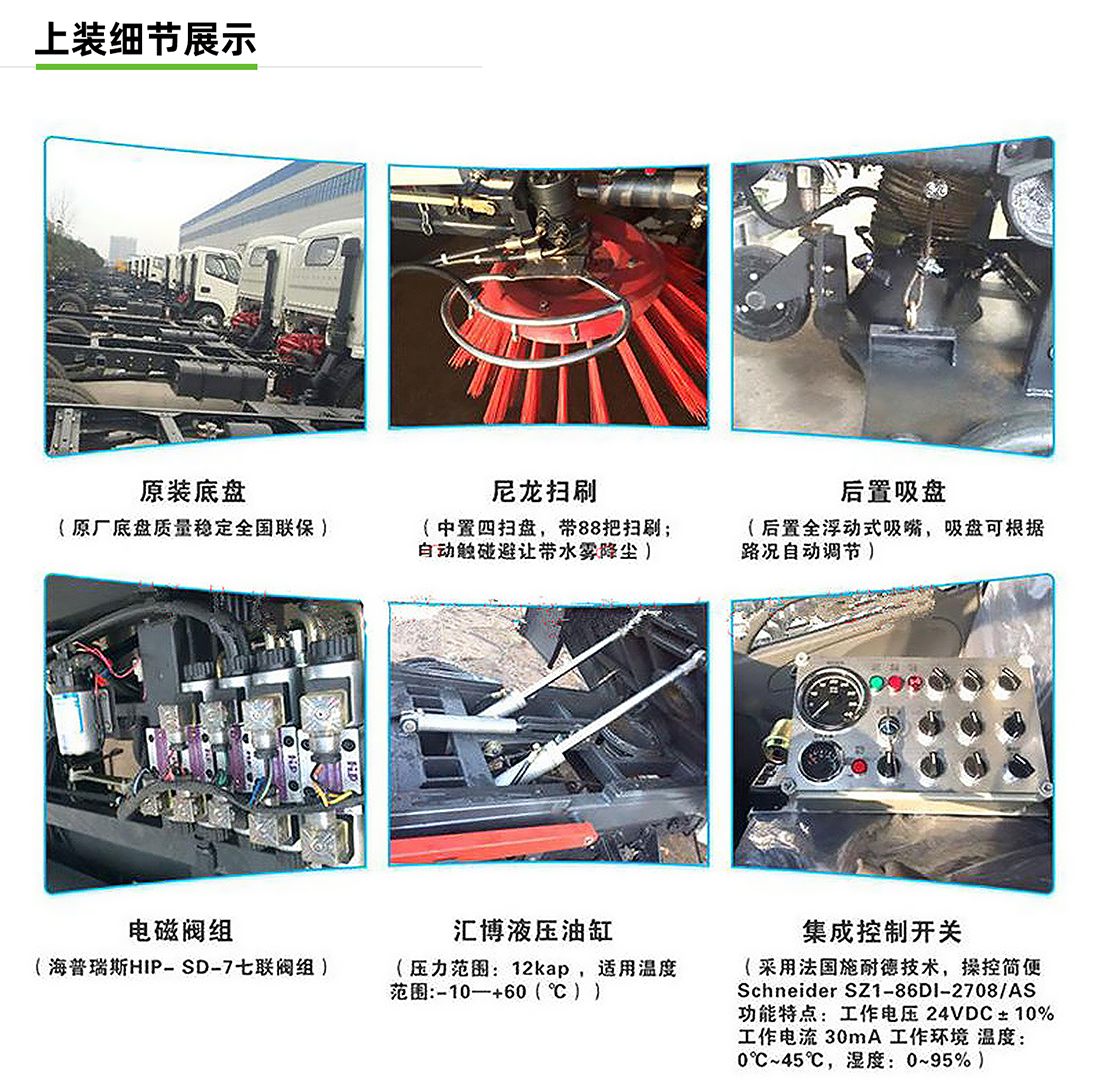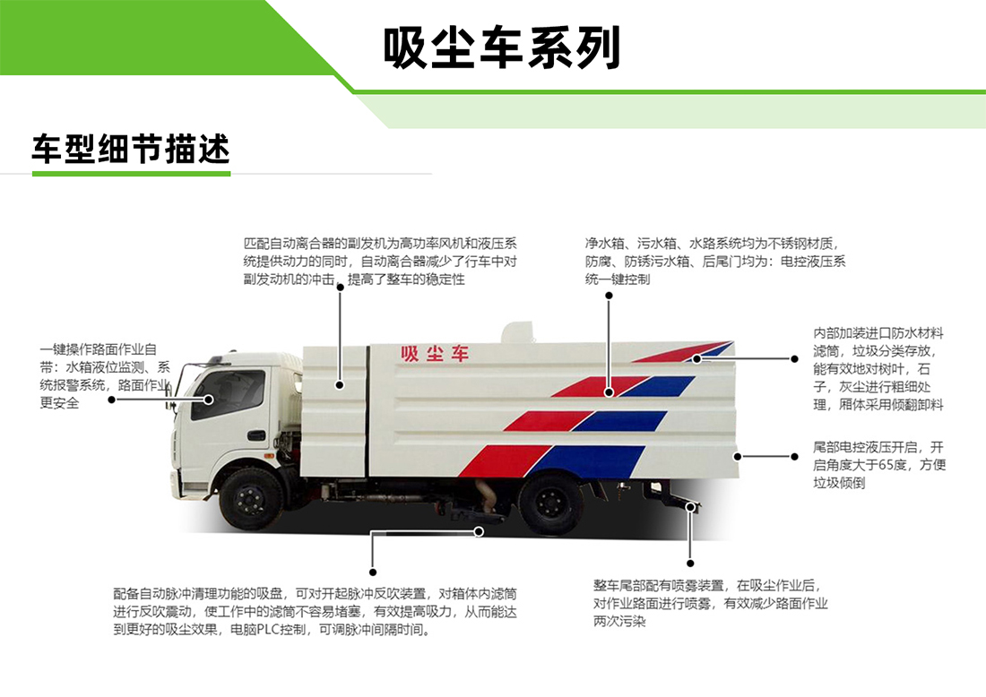 东风天锦10.5方吸尘车专用配置:尘箱:8立方米,水箱:2立方米;中置吸盘、江铃五十铃副发动机、施耐德控制开关、海普瑞斯电磁阀组、无级变速自动离合器、免维护离心式风机、高精度垃圾箱过滤系统(最高可达0.5微米),不锈钢垃圾箱、进口脉冲阀、垃圾箱举升自卸、尾部LED箭头灯、车尾雾状喷水润湿功能、倒车影像、手动泵应急系统。